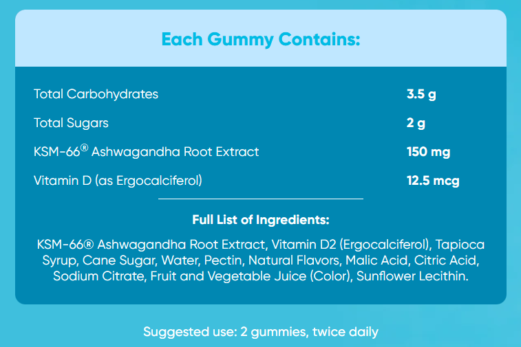 Ashwa Gummies are made with a blend of ingredients that support many incredible benefits! They’re made with KSM-66®Ashwagandha Root Extract to help reduce stress & promote relaxation; promote sleep quality; support memory & concentration; and Vitamin D to support a healthy immune system and more!